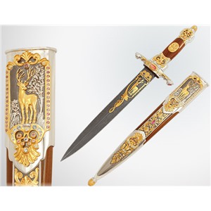 Клинок прямой двухлезвийный, ромбовидного сечения из дамасской стали. Украшен растительным орнаментом с изображением фигуры оленя.