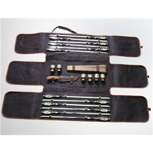 Набор включает в себя нож с ножнами, шесть стопок, веер, двенадцать шампуров.